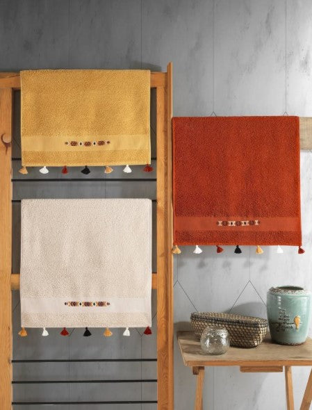 3-teiliges Handtuchset aus 100 % Baumwolle mit Stickerei und Quasten, Senfgelb-Ecru-Terra